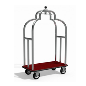 Bellman Trolleys: Classic curved-frame carts with carpeted bases used in hotel lobbies to transport guest luggage.